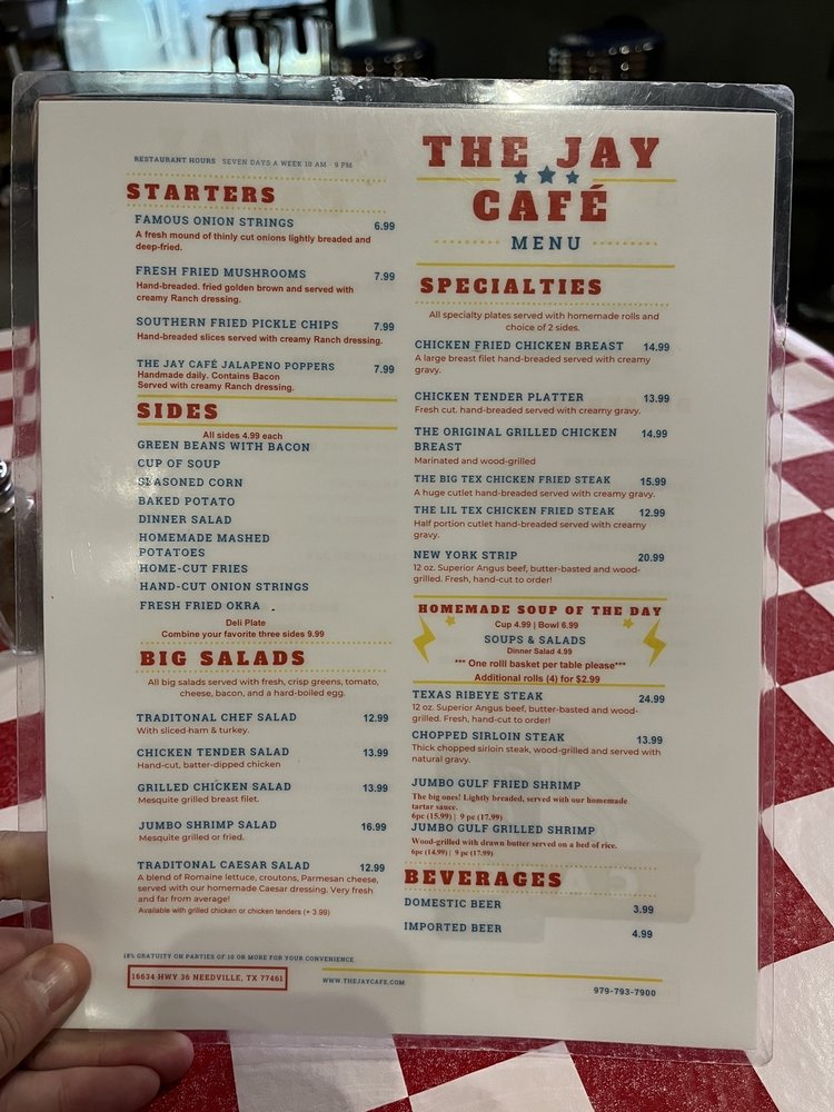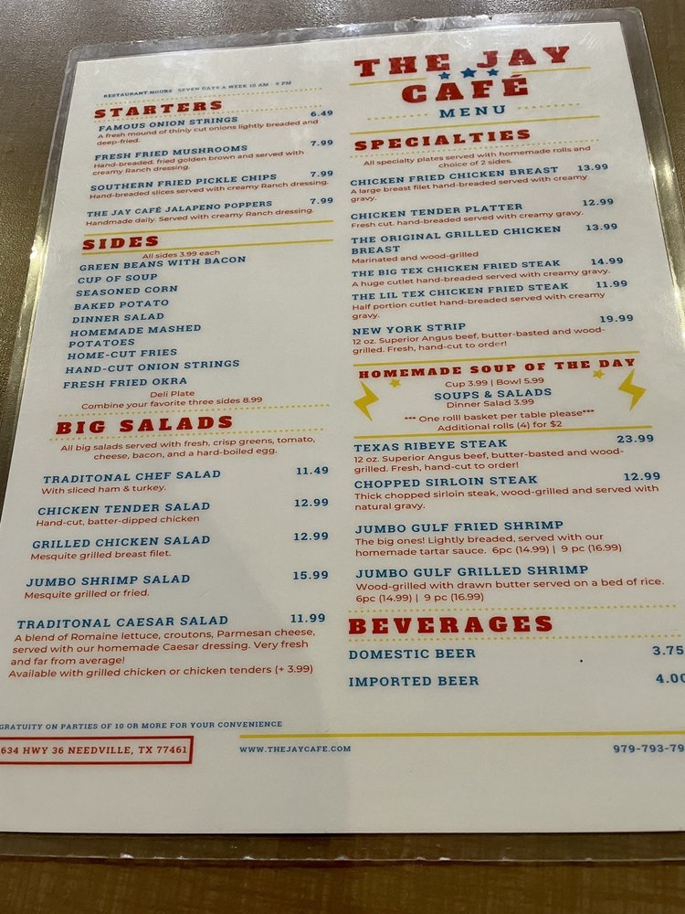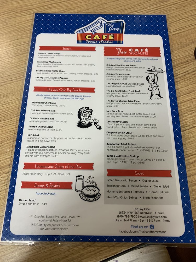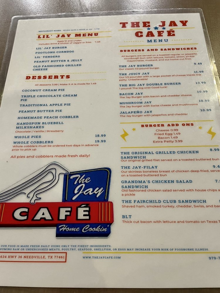 The Jay Cafe, located in Needville, TX, is a gem for American cuisine enthusiasts. Offering a variety of options, including vegan and vegetarian dishes, this casual dining spot is perfect for breakfast, lunch, dinner, and dessert. With amenities like outdoor seating, free Wi-Fi, and happy hour specials, The Jay Cafe caters to a wide range of preferences. Customers rave about the delicious food, with standout dishes like chicken fried steak, Jay cheeseburger, and homemade peanut butter pie. Friendly waitstaff and excellent service make dining here a memorable experience. Whether you're stopping in for a quick bite or a leisurely meal, The Jay Cafe is highly recommended for its fresh, flavorful fare.